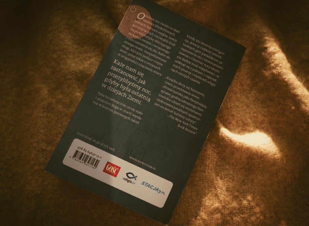 Podczas wizyty u znajomego natrafiłem na książkę „Ostatnia noc świata”, o której wcześniej nie słyszałem. Oczywiście ją pożyczyłem i w krótkim czasie zabrałem się do lektury. Miałem dość wysokie oczekiwania, jak zawsze gdy na grzbiecie książki widzę C.S. Lewis.