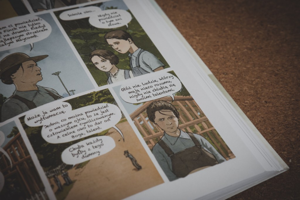 Po drugie, za adaptację tekstu w przypadku tych dwóch powieści, odpowiadał Fred Fordham. Byłem zachwycony jego pracą przy „Wielkim Gatsby’m”, wydaje mi się jednak, że w przypadku „Zabić drozda” poradził sobie z tym niełatwym zadaniem jeszcze lepiej. Przełożyć tekst powieści na grafikę jest dla mnie czymś niewyobrażalnym i bez dwóch zdań wymaga po prostu talentu. Narysować książkę tak by nie straciła swojego przekazu?! Fred Fordham to potrafi.