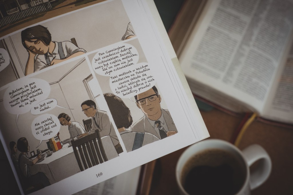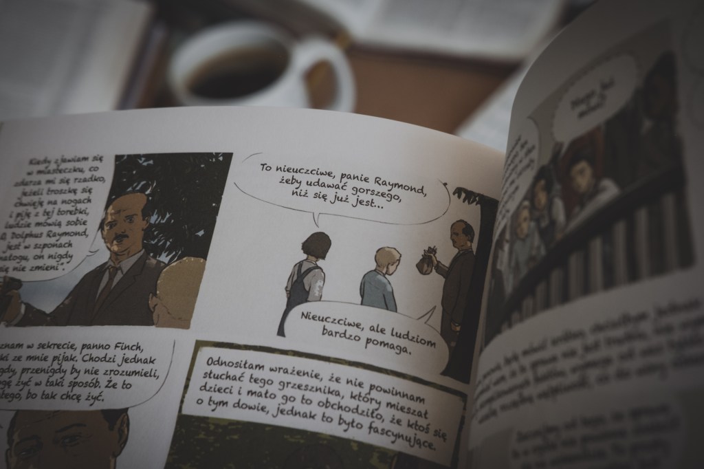 Wróćmy jednak do naszej powieści. To książka bardzo mądra i bardzo potrzebna. Ciężko mi zrozumieć dlaczego zniknęła z list lektur, i to zarówno w południowej części USA, jak i w naszym kraju. Choć akcja zbudowana jest wokół nietolerancji i dyskryminacji rasowej w Stanach Zjednoczonych lat 30-tych XX wieku, to niestety poruszane kwestie wciąż pozostają bardzo aktualne. „Zabić drozda” przekazuje wiele ponadczasowych prawd, i robi to w sposób bardzo przystępny – dobrze (dosłownie) zilustrowany.