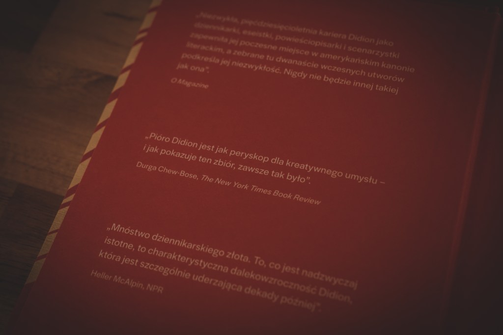 Szczęśliwie mój sceptycyzm nie znalazł zbyt wiele pożywki. Teksty Joan Didion są dokładnie takie jakie powinny być. Nakreślają problem, ale nie zamęczają nas natłokiem informacji. Autorka nie znajduje potrzeby chwalenia się wszystkim co wie na dany temat, potrafi za to w odpowiednim momencie odwołać się do własnego życia czy też doświadczeń. W swoich tekstach bywa ostra jak brzytwa, nie będąc przy tym jednak wulgarną czy obcesową. Czyta się to świetnie. I choć nie spodziewałem się, że eseje z tak zamierzchłej już przeszłości (nawet rok 2000 to przecież miniona epoka) mogą wnieść coś do mojego postrzegania teraźniejszości, z przyjemnością przyznaję się tym razem do błędu.