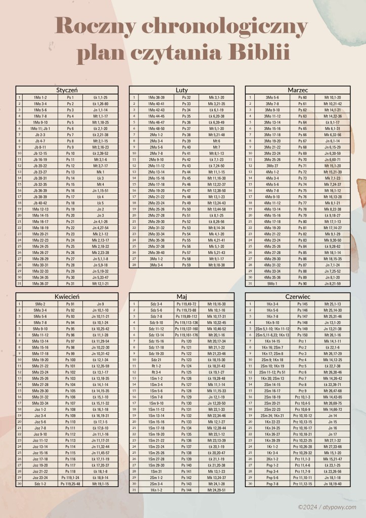 Poprawiłem drobne błędy jakie pojawiły się w planie, który opracowałem przed rokiem. Uwzględnia on chronologię opisywanych wydarzeń. Każdego dnia zaproponowane są w nim fragmenty ze Starego i Nowego Testamentu, oraz Psalm albo fragment Przypowieści Salomona. Lektura Słowa Bożego wg tego planu pomoże Ci np. lepiej uchwycić przesłanie proroków, ponieważ ich księgi będziesz czytał w tym samym czasie, co kolejne rozdziały z ksiąg historycznych, oddających kontekst w jakim działali. Został on również skonstruowany w ten sposób by jednocześnie czytać Stary i Nowe Testament.