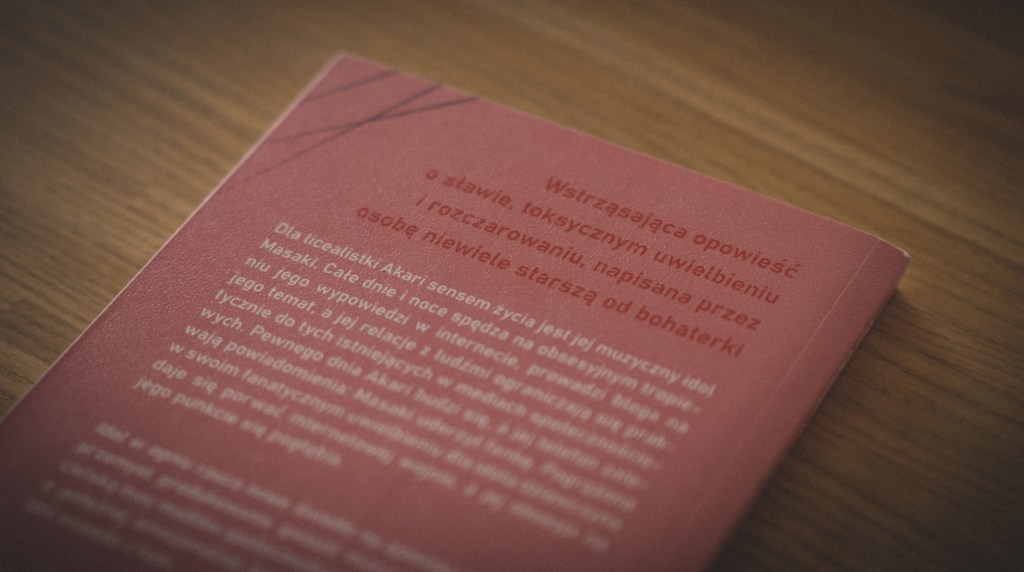 Świat Akari zaczyna się jednak chwiać, gdy Masaki zostaje zamieszany w skandal, a jego kariera stoi na krawędzi. Autorka w niezwykle subtelny, a zarazem przenikliwy sposób pokazuje, jak silna może być więź fana z idolem – więź, która potrafi pochłonąć całe życie. Akari nie ma innych pasji ani zainteresowań, nie ma przyjaciół, którzy mogliby ją wspierać. Jej obsesja na punkcie Masaki’ego jest jej jedynym azylem, a jednocześnie źródłem głębokiego cierpienia. Powieść ukazuje, jak łatwo granica między podziwem a uzależnieniem może zostać przekroczona, i jak niebezpieczne mogą być skutki emocjonalnej inwestycji w życie kogoś, kogo tak naprawdę się nie zna.