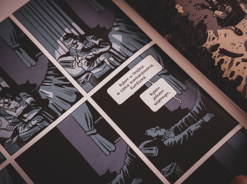 Zacząłem regularnie sięgać po powieści graficzne, i kolejny raz jestem zachwycony tą formą. „Rzeźnię numer pięć” znam dość dobrze, ponieważ czytałem tę książkę niedawno po raz drugi, a Kurt Vonnegut, z całym swoim cynizmem i specyficznym stylem, od lat należy do moich ulubionych autorów. Zastanawiam się jednak czy bez tej znajomości pierwowzoru, ta „pierwsza na świecie wierna komiksowa adaptacja” byłaby dla mnie równie zrozumiała?